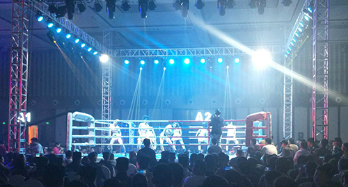 我公司承接了本次活动,在活动现场布置了高清高亮LED大屏,D10线阵音响,结合我们最新的灯光设备轰天炮,巨无霸以及明道440,为搏击赛场打造了一场完美视觉盛宴! | |