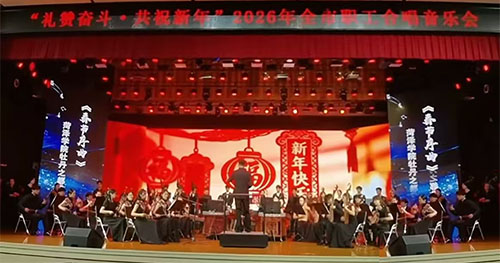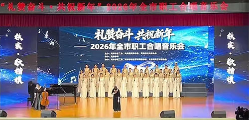 礼赞奋斗·共祝新年-2026年菏泽市职工合唱音乐会1月14日晚在菏泽学院隆重举行。我公司提前一天进场搭建,活动当天完成彩排,全程服务保障菏泽市总工会举办的合唱音乐会圆满结束。