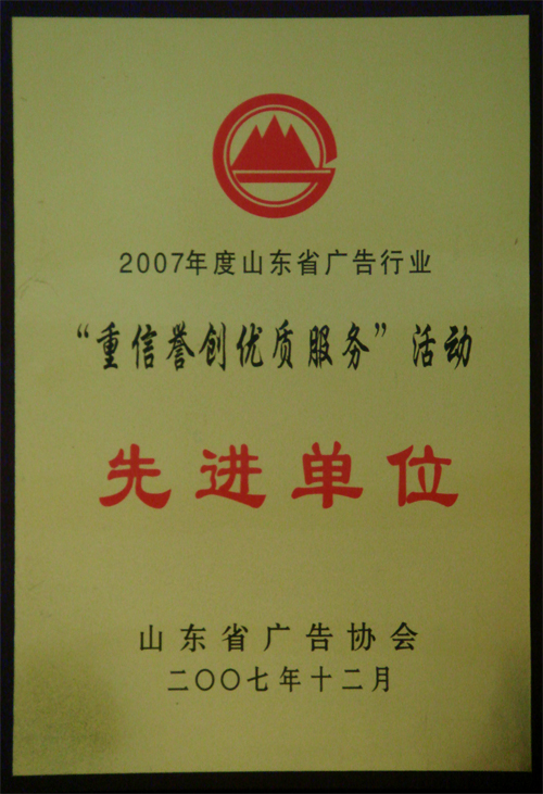 日前,山东省广告协会召开年度工作总结表彰大会,对2007年度全省广告行业“重信誉创优质服务”活动的先进单位和个人进行表彰,我公司榜上有名,被授予“重信誉创优质服务”活动的先进单位,并领取了奖牌和证书。