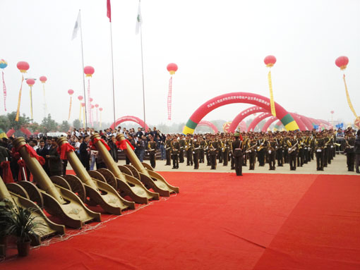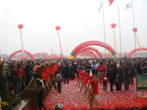 19日上午9:19,开幕式开始。当李育材同志、贾万志同志共同启动开幕引擎时,霎时间,冷焰火、彩烟燃放,礼炮鸣响,彩带飘舞,军乐队、盘鼓队、舞狮队同时演奏,开幕式现场欢呼声声,欢庆气氛直冲云天。
