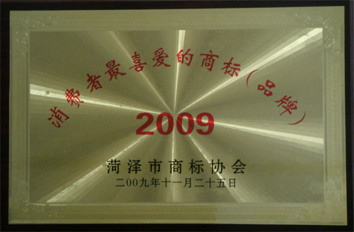 日前,我公司被菏泽市商标协会授予“2009消费者最喜爱的商标(品牌)”荣誉,并领取了奖牌和证书。