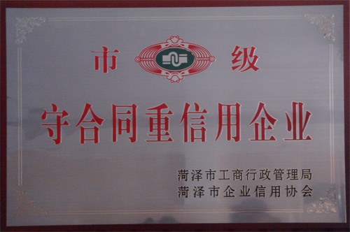 前,我公司被菏泽市工商行政管理局和菏泽市企业信用协会联合授予2009年度“守合同重信用企业”荣誉,并领取了奖牌和证书。