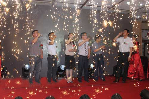 上午10点30分,主持人宣布新苏美特、大地电影、天美百货、金玉良缘入驻国贸中心签约仪式正式举行。签约完成后,大元置业总经理张烈致祝酒辞,祝愿国贸中心明天更美好。在绚丽的瀑布冷焰火闪耀下,签字代表举杯痛饮庆功酒。