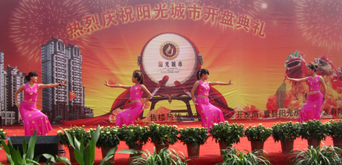 9:58,相关领导为阳光城市正式开盘启动水晶球,军乐队、舞狮队表演,彩烟、礼花炮、皇家礼炮齐鸣,阳光城市开盘典礼圆满结束,各位领导和嘉宾共同欣赏了舞蹈、豫剧小品、歌曲串烧、人体彩绘、戏曲大联唱等精彩的文艺节目。